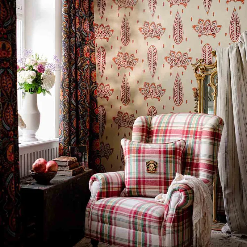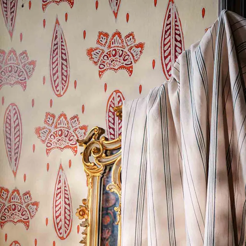 Dance through the tropical jungle to the beat of Javanese gongs and make a soundtrack from the rhythm of the rustling palms with BETHEL BATIK, a pattern showcasing the ancient Indonesian art of drawing and dying with hot wax. Decorated with traditional pod shapes and intricate crowns surrounded by delicate droplets, the subtle background brings the crafted nature of the unique forms into focus, its burned, sunset tones becoming calming neutrals against a pale backdrop.