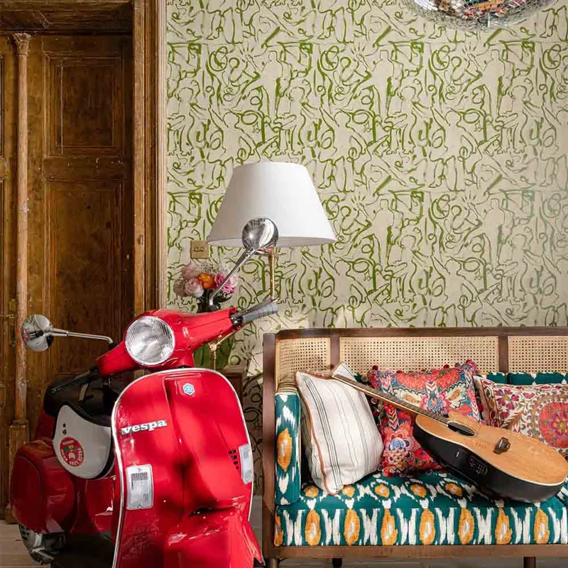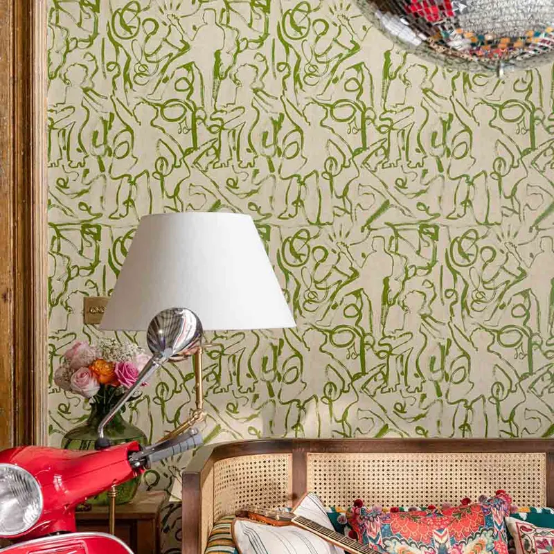 Channelling the vivacious energy of a crowd-pleasing musical performance, our ON THE STAGE wallpaper is a linear exploration of a raucous night with the band of the moment. A single line charts the twists and turns of an electric evening, echoing the sounds of strumming and singing; the clarity of the paint fading in and out to mirror the music with the vivid Greenery palette uplifting and adding energy to its neutral cream background.