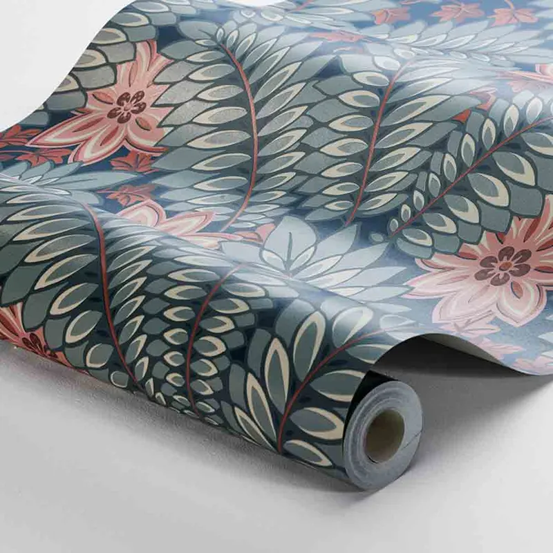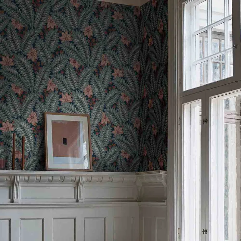 Set on a dark blue background with detailing in dusty pink and terracotta red, our Hidden Ivy wallpaper is elegantly confident and stylish. Taking its inspiration from the luxurious and playful Art Deco style and designed in 1953, fern-like leaves fill the walls as ivy and dainty flowers peek out from behind.